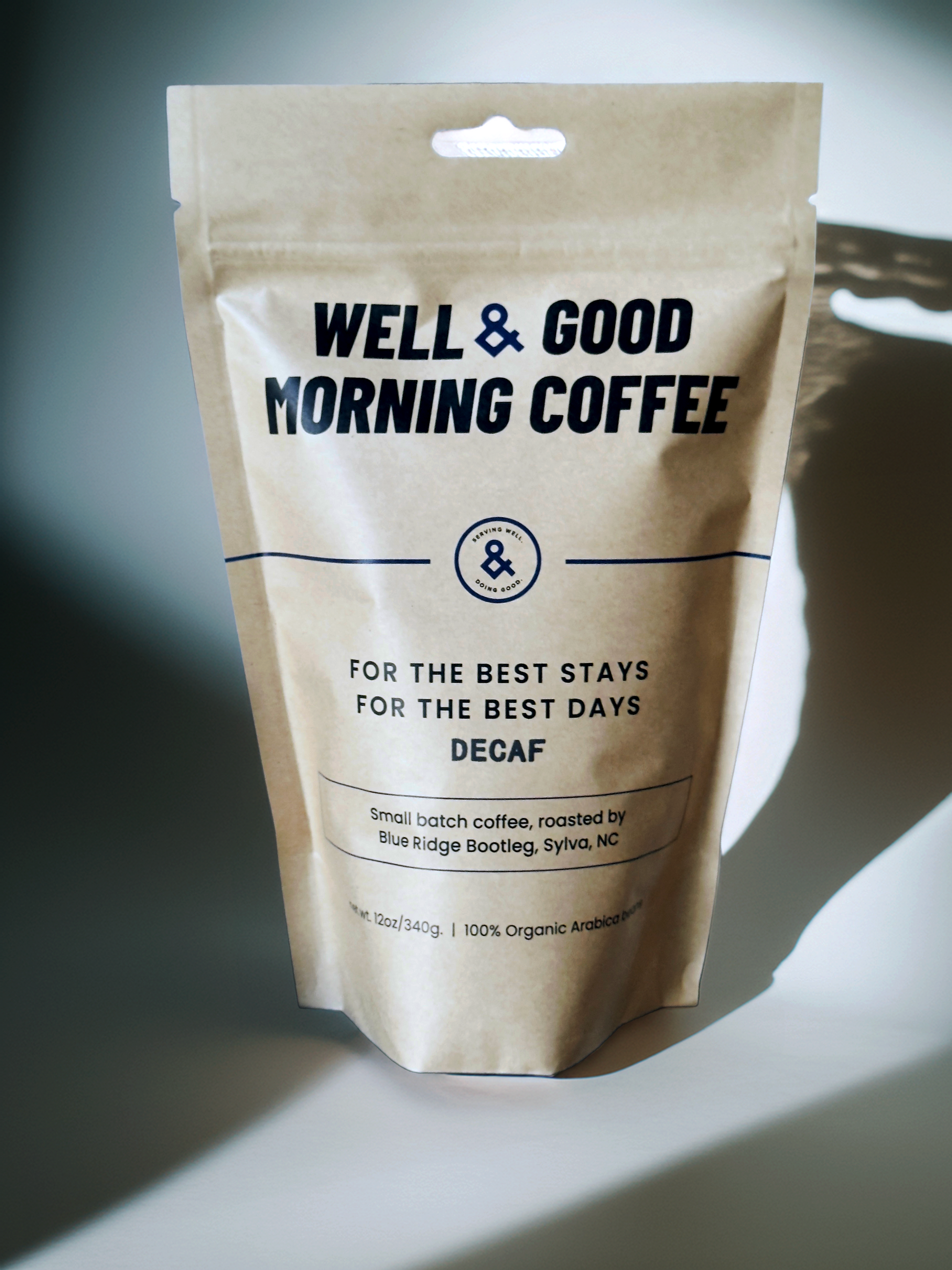 Well & Good has partnered with Good Morning Hospitality to create a proprietary medium roast ground coffee, ethically sourced and exclusively roasted by Blue Ridge Bootleg, Sylva, NC. This blend will be sure to delight guests and owners alike.